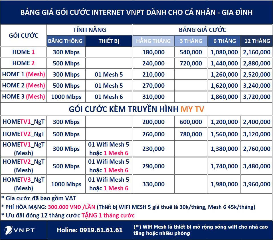 Như vậy bạn hoàn toàn có thể an tâm về chi phí khi lựa chọn mạng Internet VNPT. Mức cước phí bạn phải trả khi lắp đặt mạng là 300.000đ và hàng tháng bạn chỉ cần trả phí cho gói cước Internet đã đăng ký. Đặc biệt, với những khách hàng mới thanh toán cước trước 6 – 12 tháng sẽ được hưởng thêm ưu đãi từ 1-2 tháng sử dụng.